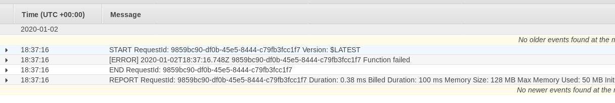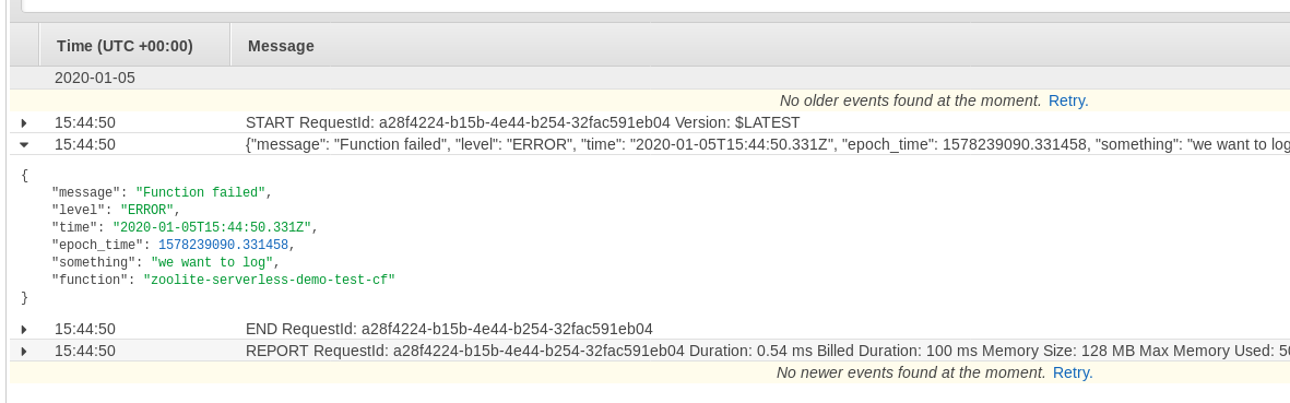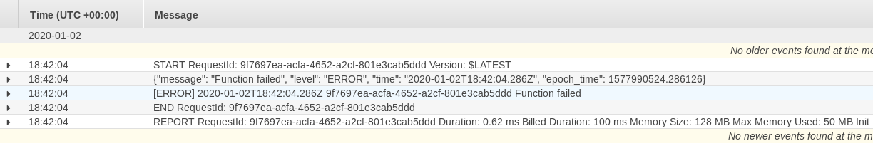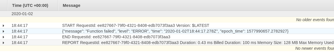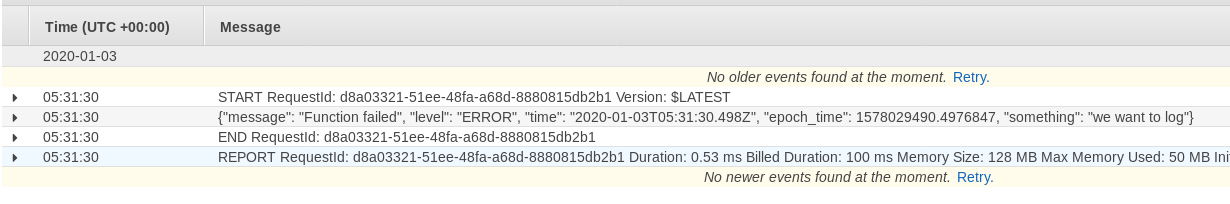 Let’s see how this looks like in Cloudwatch Logs when we run this function.
